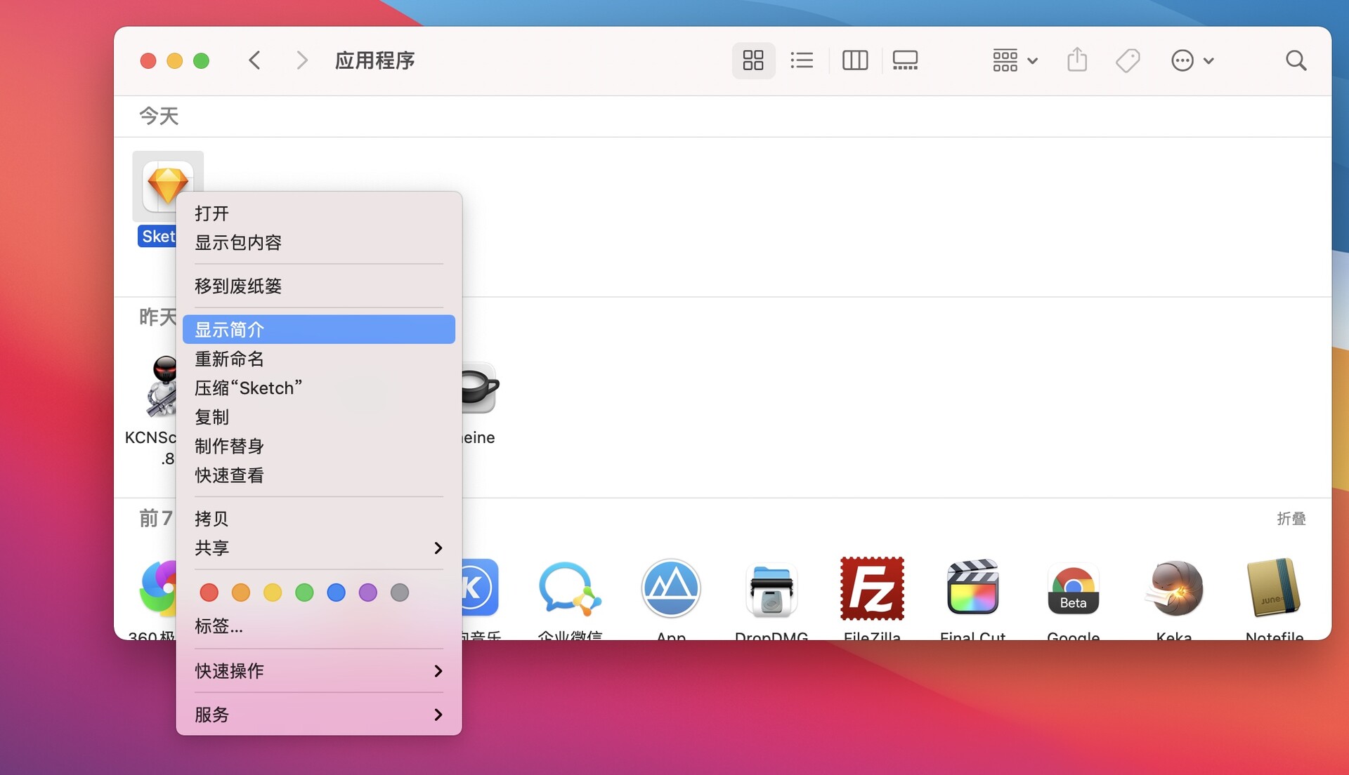 1、打开访达,进入应用程序目录,找到闪退的软件图标,在软件图标上右键选择“显示简介”,也可以选择图标然后按快捷键“command+i”键打开简介